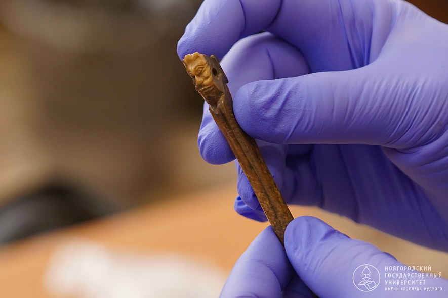 — В верхней части предмета мы видим тонкую, сложную резьбу. С одной стороны вырезана некая «личина», то есть, лицо. С другой стороны — стилизованное изображение зверя с раскрытой пастью. Получается, как будто голова человека в пасти зверя. Символику этого изображения ещё предстоит выяснить искусствоведам. Мы можем предположить здесь отсылки к романскому стилю — возможно, вещь попала в Руссу из Европы. И для Старой Руссы, и для Великого Новгорода эта находка уникальна, — пояснил директор Центра археологических исследований НовГУ Сергей Торопов.