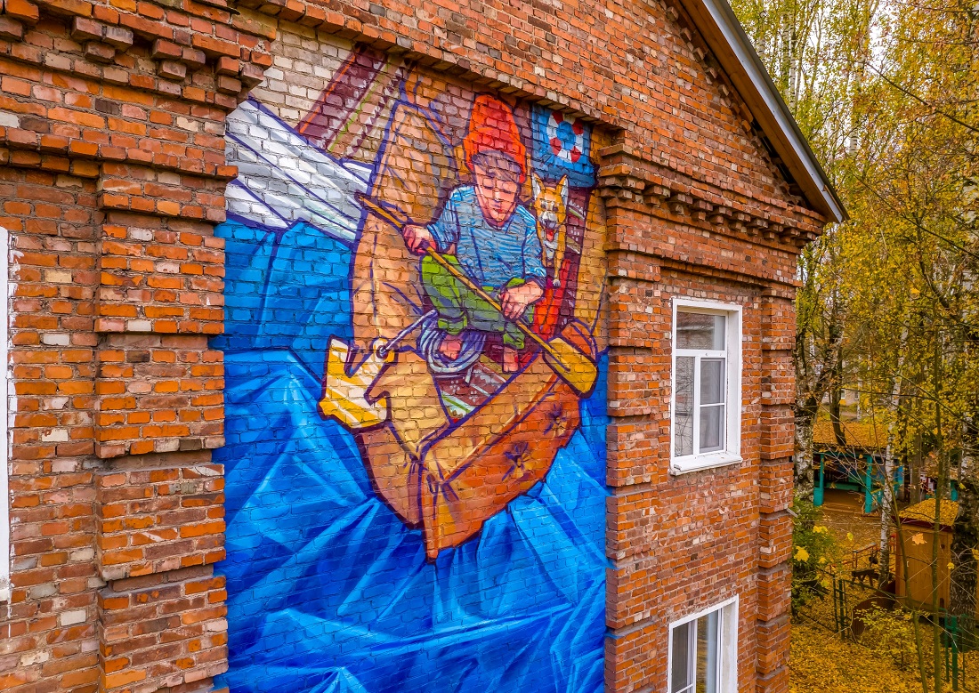 Граффити-художник Александр Морсин нарисовал мальчика в лодке на стене дома в Боровичах