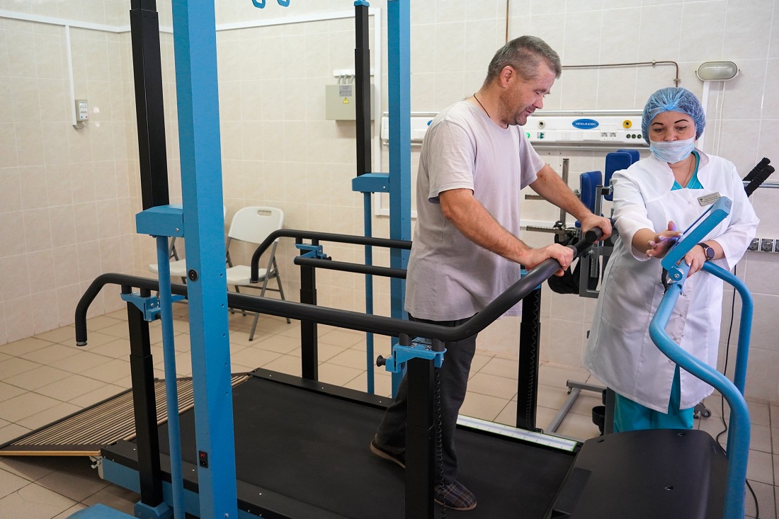 Благодаря национальному проекту «Продолжительная и активная жизнь» отделение оснащено современным оборудованием, которое направлено на восстановление движения, координации, когнитивных функций. В зале для лечебной физкультуры есть различные системы для вертикализации, аппарат опорной подошвенной нагрузки, велотренажер, специальная беговая дорожка, имитрон для имитации ходьбы и многое другое.